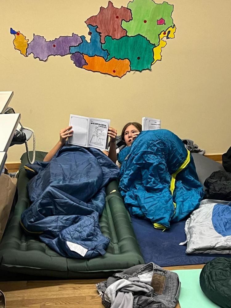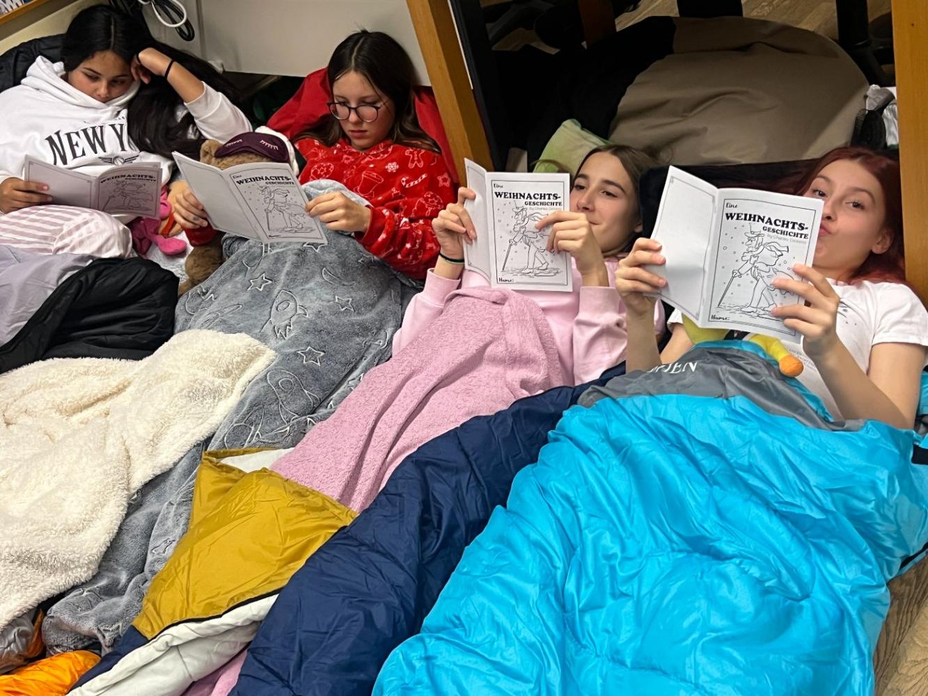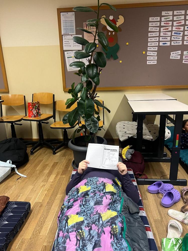 Am Vorabend des letzten Schultages vor Weihnachten erlebte die Schüler*innen der 3a eine besondere Lesenacht in der Schule. Gestärkt mit schmackhafter Pizza tauchten die Schüler*innen in die festliche Welt von Charles Dickens' Weihnachtsgeschichte ein. Bei Knabbereien und Süßigkeiten wurde anschließend der passende Film "Eine Weihnachtsgeschichte" von Disney mit den Stimmen von Jim Carrey und Colin Firth angesehen. Danach hieß es, ab in die Schlafsäcke und gute Nacht. Am nächsten Morgen startete die Klasse, fit und voller Vorfreude auf die Ferien, mit einem gemeinsamen Frühstück in den Tag. Diese Lesenacht war nicht nur ein literarisches Erlebnis, sondern auch ein wunderbarer Auftakt für die Weihnachtszeit - voller Gemeinschaft, Spaß und festlicher Stimmung.